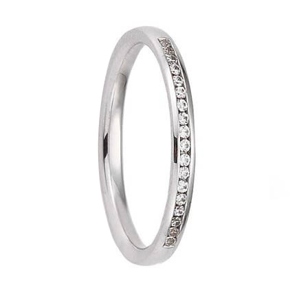 Manufaktur Gerstner - Deutschland. Firmengründung 1861, seit 6 Generationen in Familienbesitz, gehört zu den ältesten und erfahrensten Trauringherstellern in Europa. Edler Verlobungsring in 585 Weissgold seidenmatt. 11 Brillanten zusammen 0,055 ct. TW/SI. Brillanten in Kanalfassung gefasst. Breite 2,1 mm.