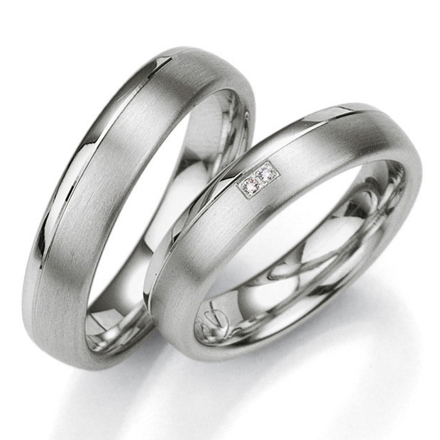 Trauringe der Marke Breuning, KOLLEKTION Silver with Diamonds 1. Herrliche Partnerringe in 925 Silber-platiniert seidenmatt und poliert. 2 Brillanten 0,013 ct. W/SI. Breite 5 mm.