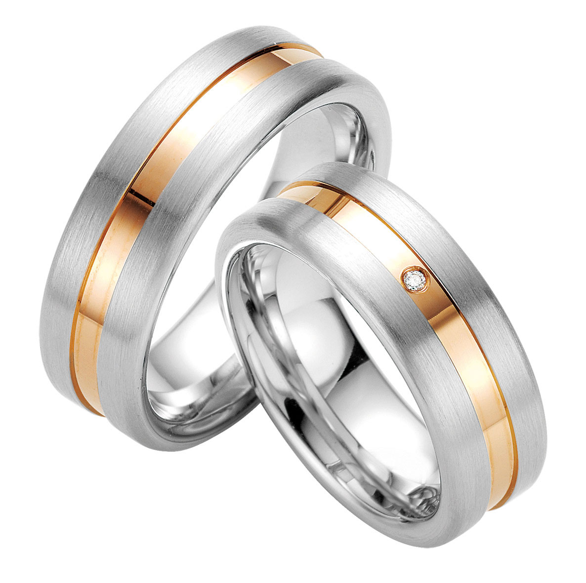 Trauringe der Marke Breuning, KOLLEKTION Silver with Diamonds 3. Herrliche Partnerringe in 925 Silber platiniert-Rotgold vergoldet. 1 Brillant 0,01 ct. W/SI. Breite 7,5 mm.