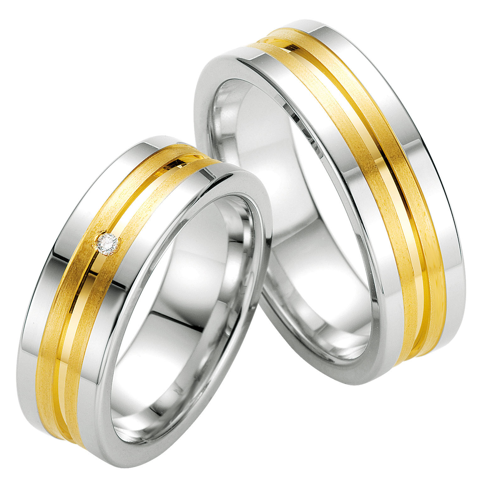 Trauringe der Marke Breuning, KOLLEKTION Silver with Diamonds 3. Herrliche Partnerringe in 925 Silber platiniert-Gelbgold vergoldet. 1 Brillant 0,015 ct. W/SI. Breite 7 mm.