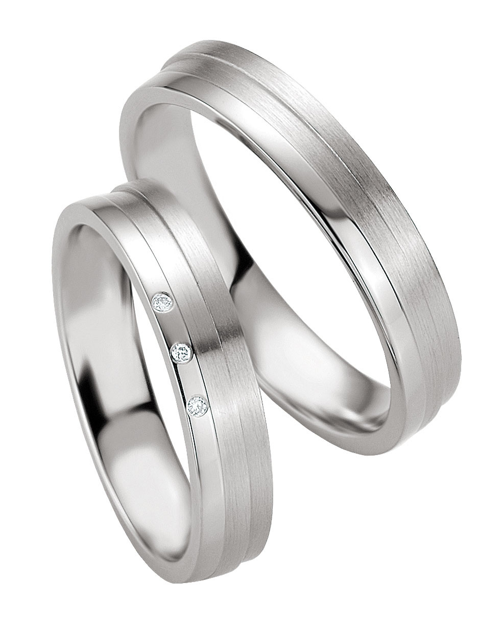 Trauringe der Marke Breuning, KOLLEKTION Silver with Diamonds 4. Herrliche Partnerringe in 925 Silber platiniert seidenmatt und poliert. 3 Brillanten 0,017 ct. W/SI. Breite 4,5 mm.