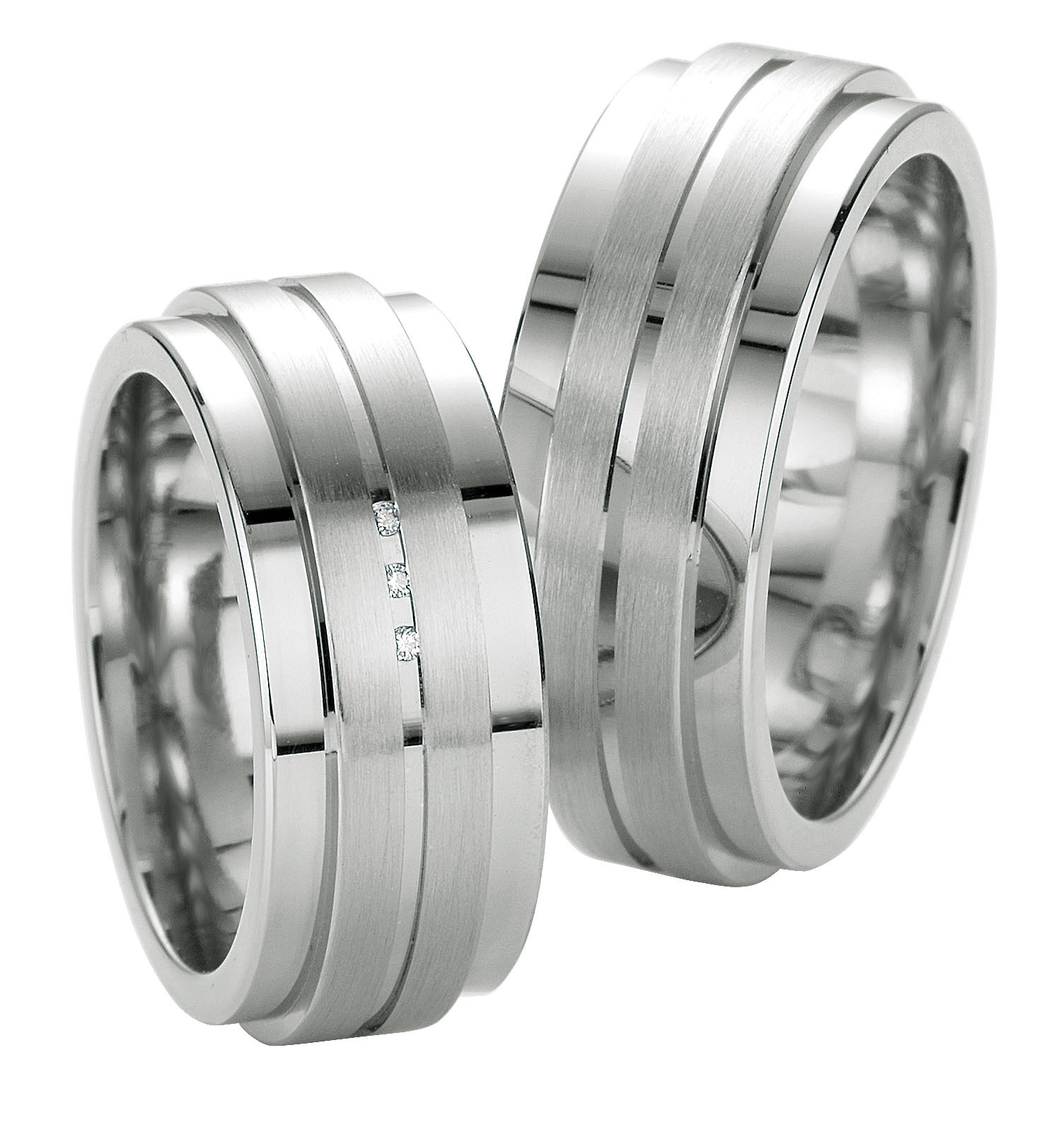 Trauringe der Marke Breuning, KOLLEKTION Silver with Diamonds 3. Herrliche Partnerringe in 925 Silber platiniert seidenmatt und poliert. 3 Brillanten 0,017 ct. W/SI. Breite 9 mm.