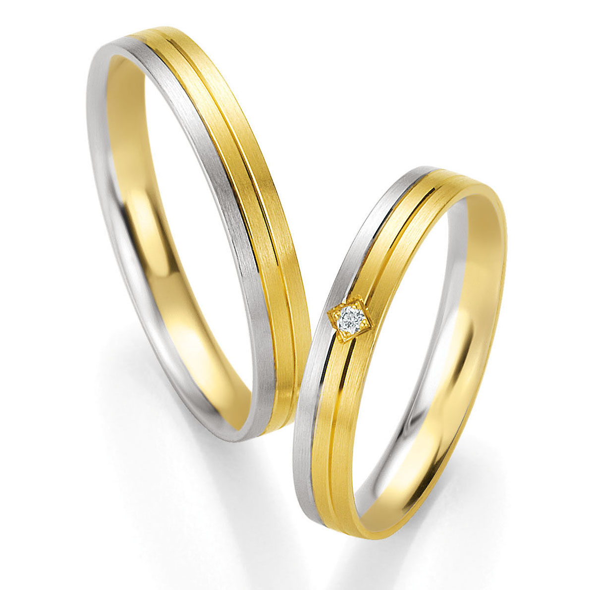Trauringe der Marke Breuning, Serie BASIC LIGHT 2. Herrliche klassische Eheringe in 333 Gelbgold-Weissgold seidenmatt. 1 Brillant 0,02 ct. W/SI. Breite 3,5 mm.