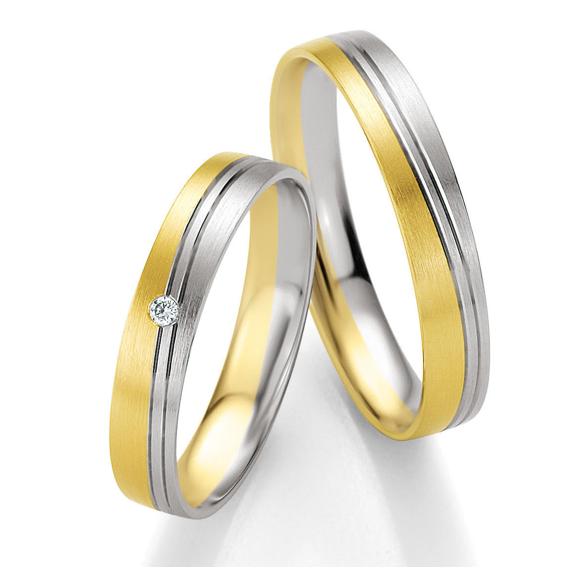 Trauringe der Marke Breuning, Serie BASIC LIGHT 2. Herrliche klassische Eheringe in 333 Gelbgold-Weissgold seidenmatt. 1 Brillant 0,02 ct. W/SI. Breite 4 mm.