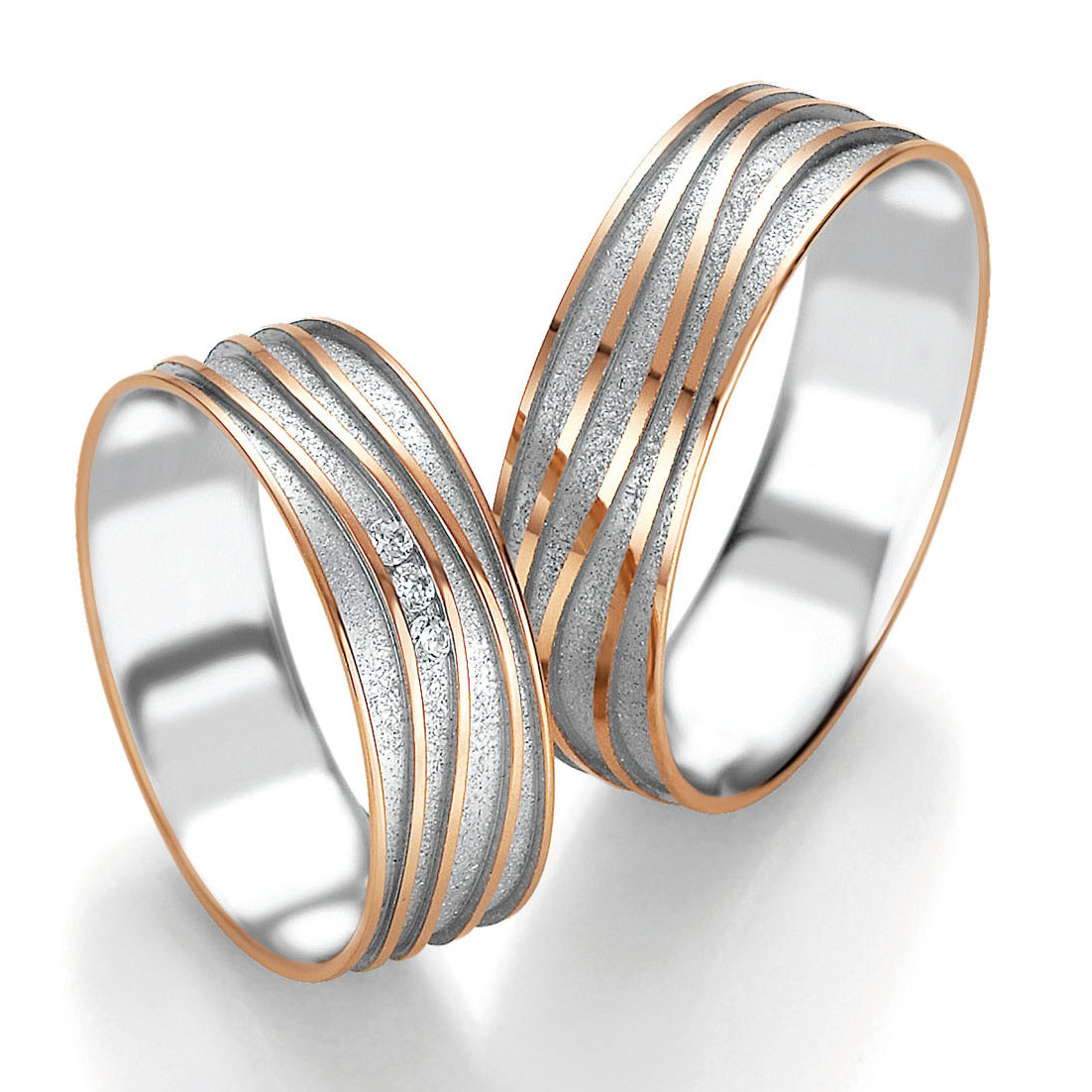 EKLUSIVE Memoire Trauringe der Marke Breuning, Serie DESIGN. Wundervolle Eheringe in 585 Weissgold sandmatt-Rotgold poliert. 3 Brillanten zusammen 0,06 ct. W/SI. Breite 7,00 mm.