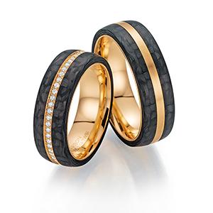 Diese Ringe sorgen für Aufsehen. Futuristische und einzigartige Ringe in 585 Apricotgold und Carbon. Carbon ist extrem leicht, so dass auch stärkere, breite Ringe ein erstaunlich niedriges Gewicht aufweisen. Das Material ist äußerst beständig gegen Chemikalien und Temperaturschwankungen und zeigt beim Tragen zudem kaum Abnutzungserscheinungen.