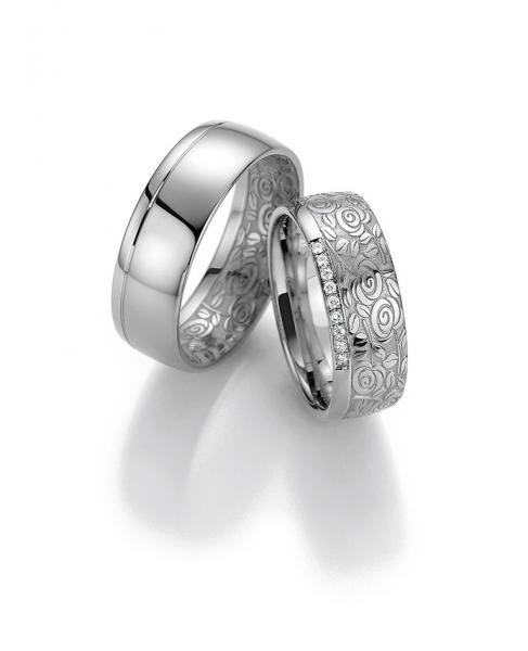 Diese prächtige Hochzeitsringe sorgen für ein herrliches Aussehen in 950 Platin seidenmatt und poliert gemustert. Die Trauringe werden auch als "Rosenring" genannt. 9 entzückende Brillanten zusammen 0,045 ct. TW/SI. Breite 7,50 mm. Der Damenring kann problemlos graviert werden von innen, der Herrenring wäre die Gravur "untereinander" machbar, da nicht viel Platz vorhanden ist. Kotaktieren Sie uns einfach. Aus der Pforzheimer Manufaktur. Manufaktur Fischer - Deutschland. Eine Firma mit Tradition und gutem Preis-Leistungsverhältnis.