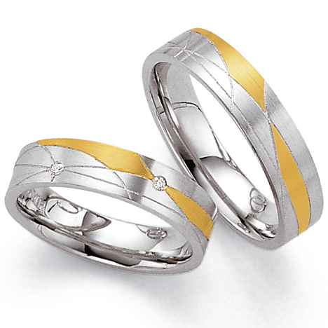 Manufaktur Fischer - Deutschland. Edle Trauringe in 950 Platin kombiniert mit 750 Gelbgold seidenmatt aus der Pforzheimer Manufaktur. Eine Firma mit Tradition und gutem Preis-Leistungsverhältnis. 1 Brillant 0,05 ct. TW/IF - lupenrein. Breite 5,00 mm.