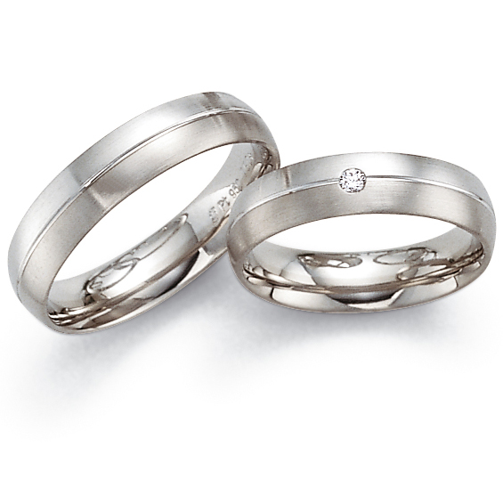 Manufaktur Fischer - Deutschland. Edle Trauringe in 950 Platin kombiniert mit 750 Graugold seidenmatt aus der Pforzheimer Manufaktur. Eine Firma mit Tradition und gutem Preis-Leistungsverhältnis. 1 Brillant 0,02 ct. TW/IF - lupenrein. Breite 5,00 mm.