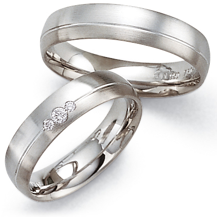 Manufaktur Fischer - Deutschland. Edle Trauringe in 950 Platin kombiniert mit 750 Graugold seidenmatt aus der Pforzheimer Manufaktur. Eine Firma mit Tradition und gutem Preis-Leistungsverhältnis. 3 Brillanten zusammen 0,06 ct. TWIF - lupenrein. Breite 5,00 mm.
