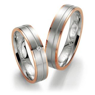 Manufaktur Fischer - Deutschland. Edle Trauringe in 333 Weissgold seidenmatt und poliert - Rotgold poliert . 1 Brillant 0,015 ct TW/SI. Breite 5,00 mm.