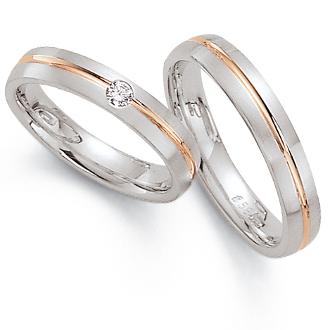 Manufaktur Fischer - Deutschland. Edle Trauringe in 585 Weissgold seidenmatt - Rotgold poliert aus der Pforzheimer Manufaktur. Eine Firma mit Tradition und gutem Preis-Leistungsverhältnis. 1 Brillant 0,07 ct TW/SI. Breite 4,0 mm.