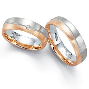Manufaktur Fischer - Deutschland. Edle Trauringe in 585 Weiss / Rotgold seidenmatt aus der Pforzheimer Manufaktur. Eine Firma mit Tradition und gutem Preis-Leistungsverhältnis. 1 Brillant 0,035 ct. TW/SI. Breite 6,00 mm.