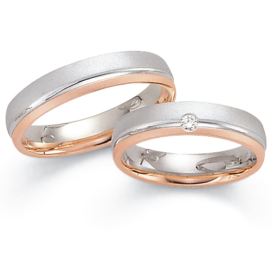 Manufaktur Fischer - Deutschland. Edle Trauringe in 585 Weiss-Rotgold sandmatt aus der Pforzheimer Manufaktur. Eine Firma mit Tradition und gutem Preis-Leistungsverhältnis. 1 Brillant 0,045ct TW/SI. Breite 5,0 mm.