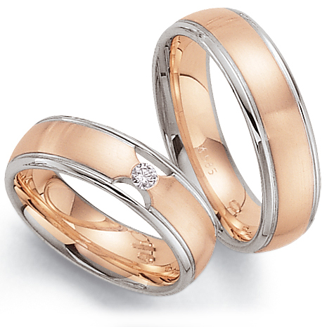 Manufaktur Fischer - Deutschland. Edle Trauringe in 585 Weissgold poliert / Rotgold seidenmatt aus der Pforzheimer Manufaktur. Eine Firma mit Tradition und gutem Preis-Leistungsverhältnis. 1 Brillant 0,07 ct. TW/SI. Breite 6,50 mm.