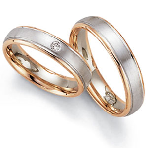 Manufaktur Fischer - Deutschland. Edle Trauringe in 585 Weissgold seidenmatt - Rotgold poliert aus der Pforzheimer Manufaktur. Eine Firma mit Tradition und gutem Preis-Leistungsverhältnis. 1 Brillant 0,04 ct. TW/SI. Breite 5,00 mm.