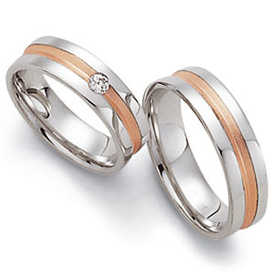 Manufaktur Fischer - Deutschland. Edle Trauringe in 585 Weissgold poliert - Rotgold sandmatt aus der Pforzheimer Manufaktur. Eine Firma mit Tradition und gutem Preis-Leistungsverhältnis. 1 Brillant 0,08 ct TW/SI. Breite 6,0 mm.