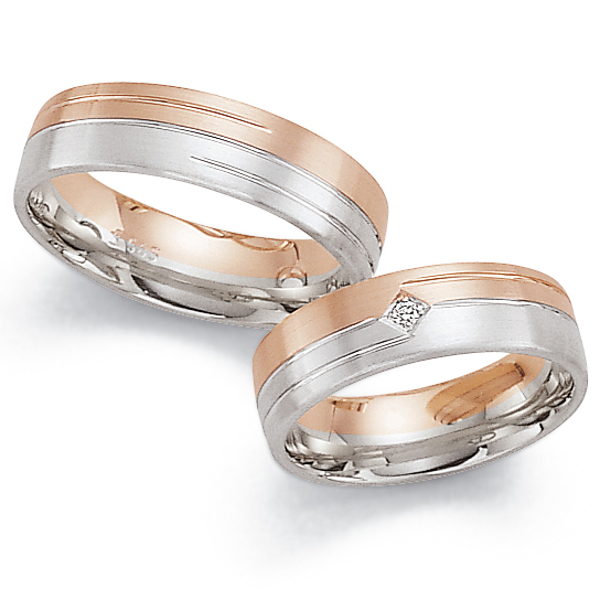 Manufaktur Fischer - Deutschland. Edle Trauringe in 585 Weiss-Rotgold seidenmatt aus der Pforzheimer Manufaktur. Eine Firma mit Tradition und gutem Preis-Leistungsverhältnis. 1 Brillant 0,02 ct TW/SI. Breite 6,0 mm.