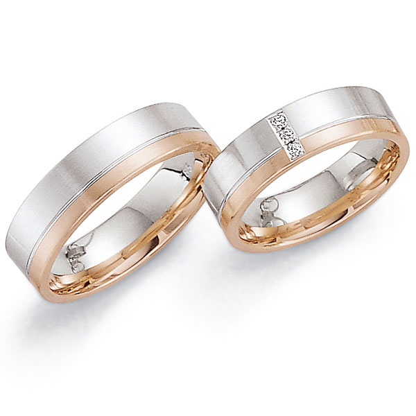 Manufaktur Fischer - Deutschland. Edle Trauringe in 585 Weiss-Rotgold seidenmatt aus der Pforzheimer Manufaktur. Eine Firma mit Tradition und gutem Preis-Leistungsverhältnis. 3 Brillanten 0,03 ct TW/SI. Breite 6,0 mm.