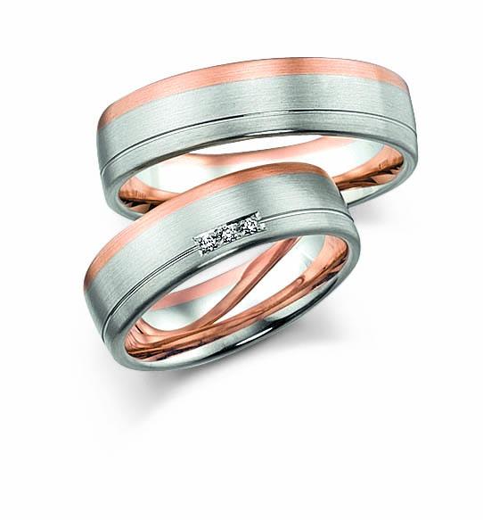 Manufaktur Fischer - Deutschland. Edle Trauringe in 585 Graugold / Rotgold seidenmatt aus der Pforzheimer Manufaktur. Eine Firma mit Tradition und gutem Preis-Leistungsverhältnis. 3 Brillanten zusammen 0,018 ct. TW/SI. Breite 6,00 mm.