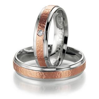 Manufaktur Fischer - Deutschland. Edle Trauringe in 333 Weissgold poliert - Rotgold gehämmert aus der Pforzheimer Manufaktur. Eine Firma mit Tradition und gutem Preis-Leistungsverhältnis. 1 Brillant 0,03 ct. TW/SI. Breite 5,00 mm.