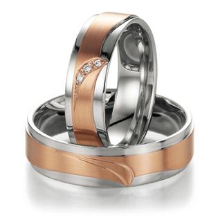 Manufaktur Fischer - Deutschland. Edle Trauringe in 585 Weiss-Rotgold seidenmatt aus der Pforzheimer Manufaktur. Eine Firma mit Tradition und gutem Preis-Leistungsverhältnis. 3 Brillanten 0,019 ct TW/SI. Breite 6,00 mm.