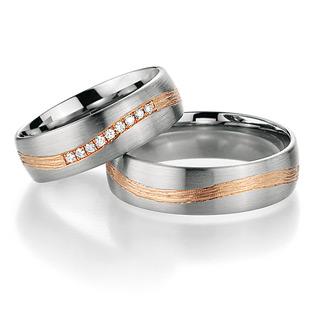 Manufaktur Fischer - Deutschland. Edle und wunderschöne Trauringe in 585 Weissgold / Rotgold seidenmatt mit Wellenlinie aus der Pforzheimer Manufaktur. Eine Firma mit Tradition und gutem Preis-Leistungsverhältnis. 9 Brillanten zusammen 0,054 ct. TW/SI. Breite 6,00 mm.