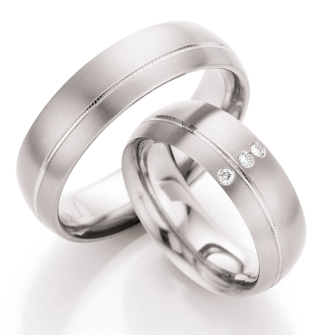 Reizvolle Trauringe aus Titan. Oft wird der Damenring als Antragschmuck auch einzeln bestellt. Bei Fragen wenden Sie sich bitte einfach bei uns. Wiener Trauringmanufakur Brüder Nowotny gegründet 1881. Titanringe seidenmatt-Fuge poliert. 3 Brillanten 0,03 ct. W/SI. Breite 6,50 mm. Bestellbar in Größen 45-75.