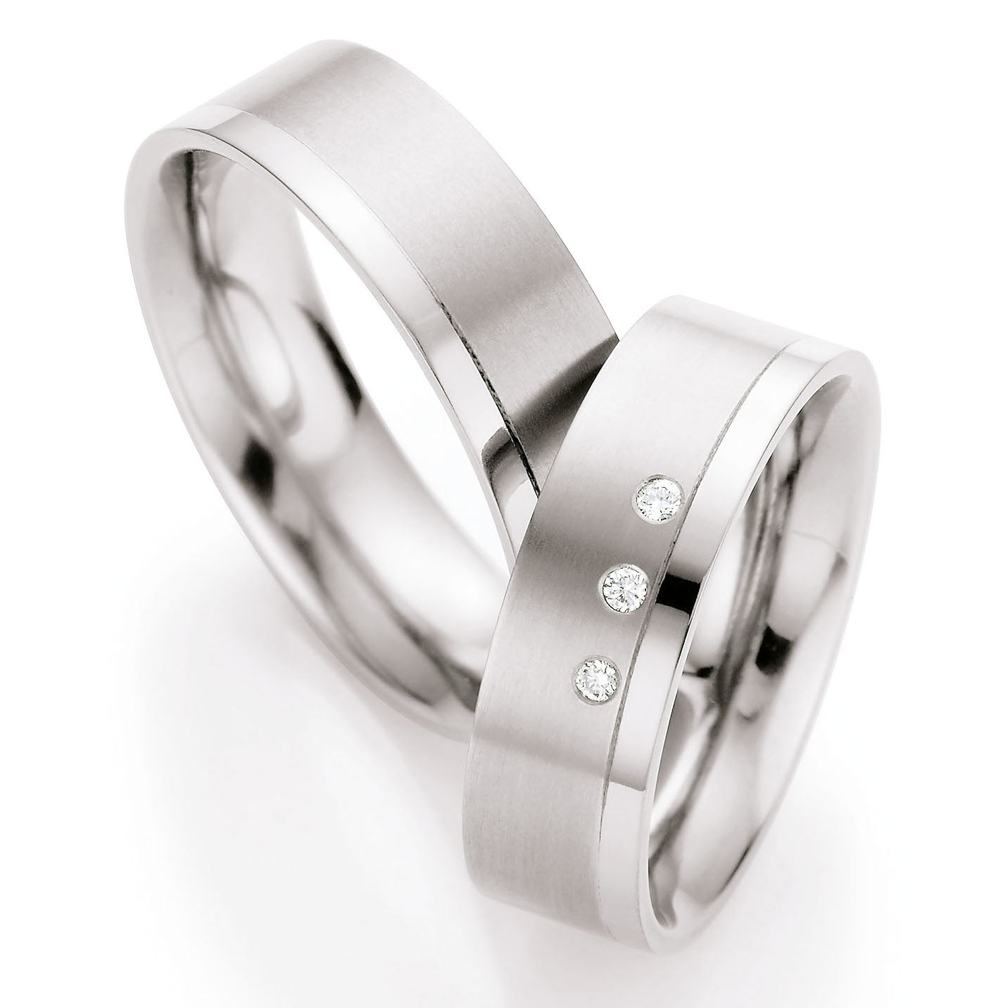 Reizvolle Trauringe aus Titan. Oft wird der Damenring als Antragschmuck auch einzeln bestellt. Bei Fragen wenden Sie sich bitte einfach bei uns. Wiener Trauringmanufakur Brüder Nowotny gegründet 1881. Titanringe poliert und seidenmatt. 3 Brillanten 0,03 ct. W/SI. Breite 6,50 mm. Bestellbar in Größen 45-75.