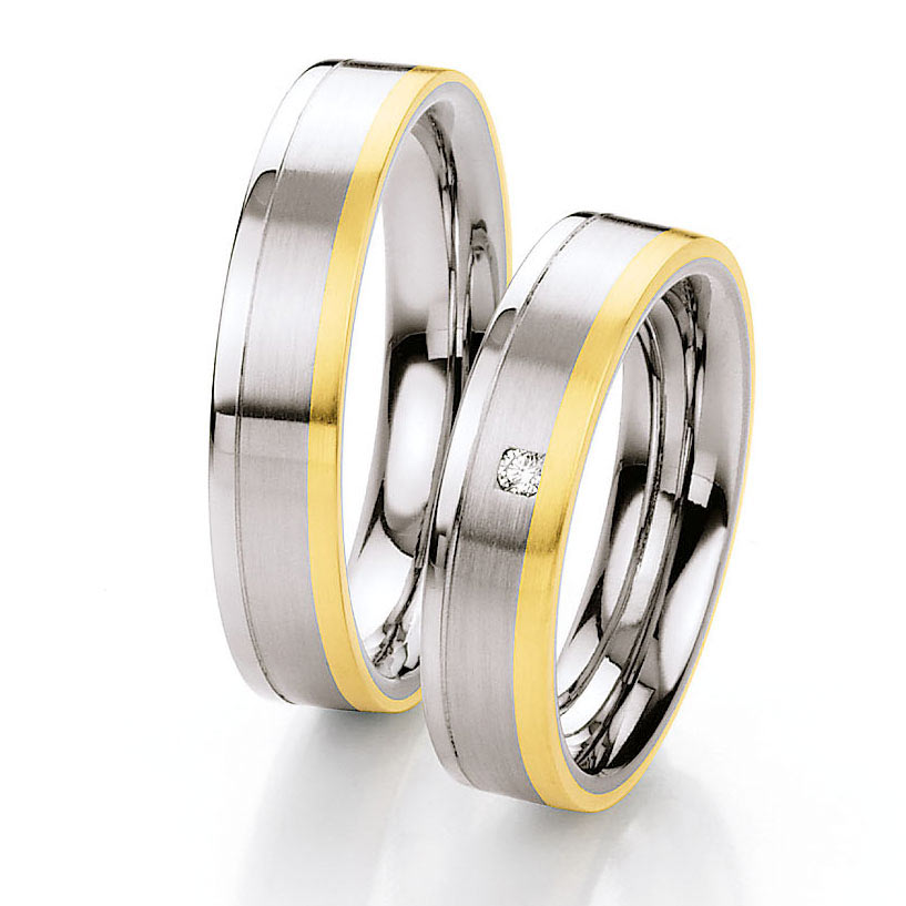 Lebhafte Partnerringe aus Edelstahl-Gold. Bei dem "Gong" sagt SIE: Schatz, der ist es; diese Ringe spenden einem Freude. Der Damenring mit funkeldem Brillantbesatz. Die Größen erhältlich von 45-75. Manufaktur Nowotny - Österreich. Partnerringe aus Edelstahl seidenmatt und poliert in Kombination mit 585 Gold seidenmatt und poliert. 1 Brillant 0,03 ct. W/SI. Breite 5,00 mm.