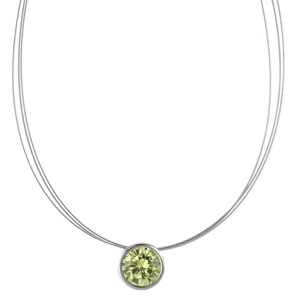 Farbenfroh, verspielt und formvollendet: Der Star dieses farbenfrohen Halsreifs ist ohne Zweifel der runde, facettierte Zirkonia in funkelnd frischen apfelgrün. Der Halsreif besteht aus 3 feinen Edelstahlseilen und ist durch seinen Clipverschluss einfach und sicher in der Handhabung. Das Collier passt zu jedem Anlass und ist ideal kombinierbar mit allen Schmuckstücken der TeNo-JOY-Serie ob Statement-Ringe, Charm-Anhänger, Ohrschmuck, Colliers oder Armbänder.